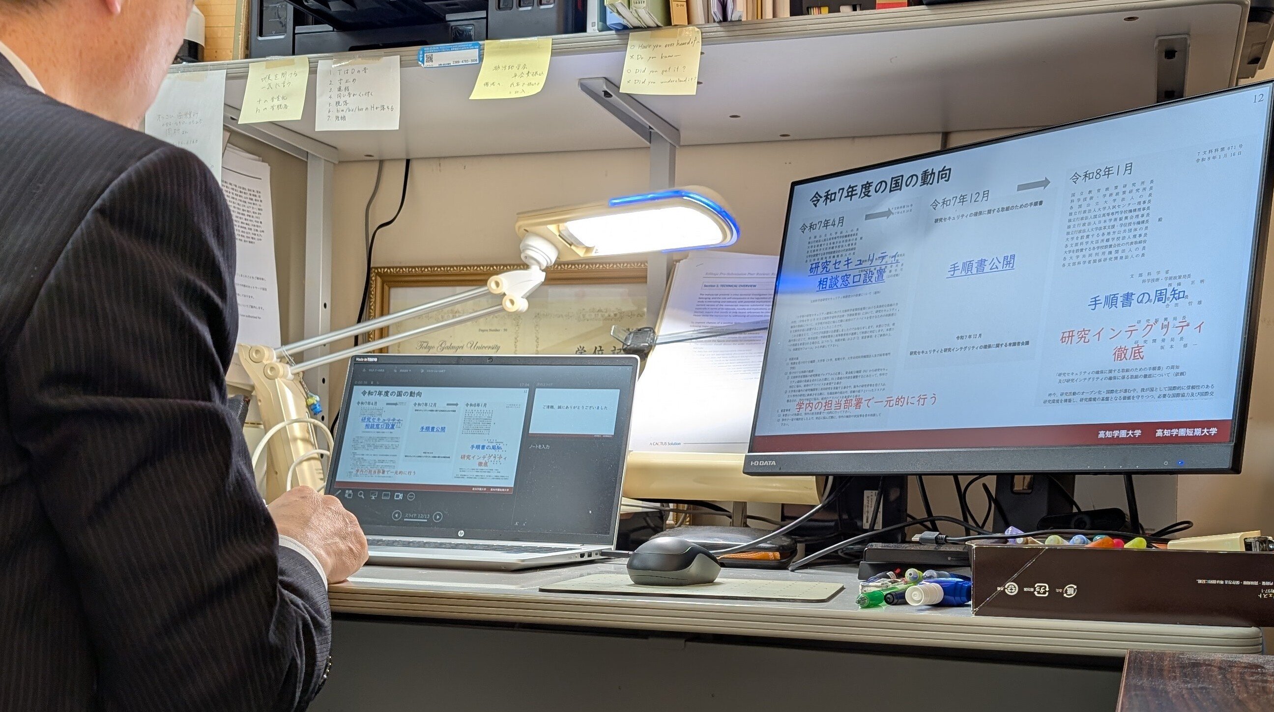 高知学園大学・高知学園短期大学では、公正な研究活動を進めるため、研究に関する不正防止委員会が中心となって研究倫理研修会を実施しています。 2月3日には、全教職員を対象に令和7年度第5回研修会「研究インテグリティ・研究セキュリティについて」がオンラインで開催されました。 教職員一同、意図せぬ形で困った事態に巻き込まれないよう、日頃からリスクに備えて客観的に判断することの大切さを学びました。 本学では、公正な研究活動を通して得られた知見を大学教育へ還元しています。 研修を進行する担当者の「研究に関する不正防止委員会」委員長の様子